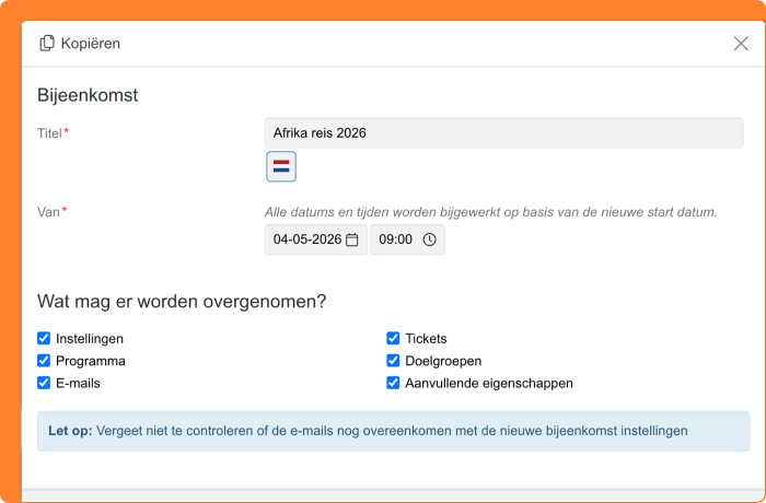 Are you copying an existing event as a basis for a new one? A notification now appears when you copy the emails as well. This reminder prompts you to review and update the email texts for the new event.