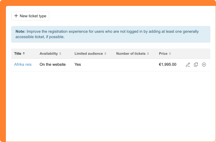 You can now copy tickets, making it faster to create new ticket types with similar settings. A search field has also been added so you can quickly find the right ticket. The ticket overview now displays extra information per ticket type as well: availability, whether there's a target audience restriction, and the number of tickets configured.