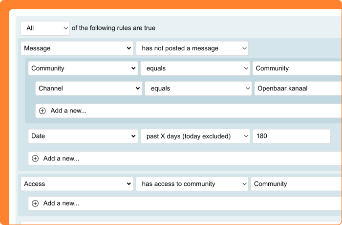 A powerful application is the combination with Marketing Automation. Set up a journey that automatically reminds community users after a period of inactivity about the value of their contribution. This way, you keep your community lively without having to manually monitor everyone.