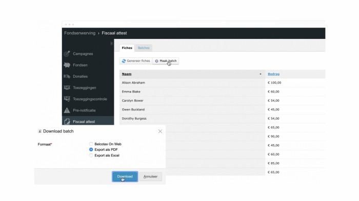 In slechts een paar klikken worden al je donaties verwerkt en omgevormd tot fiscale attesten. Zo krijg je fiscale attesten die je meteen kan versturen en een bestand dat je in enkele seconden kan opladen in Belcotax!