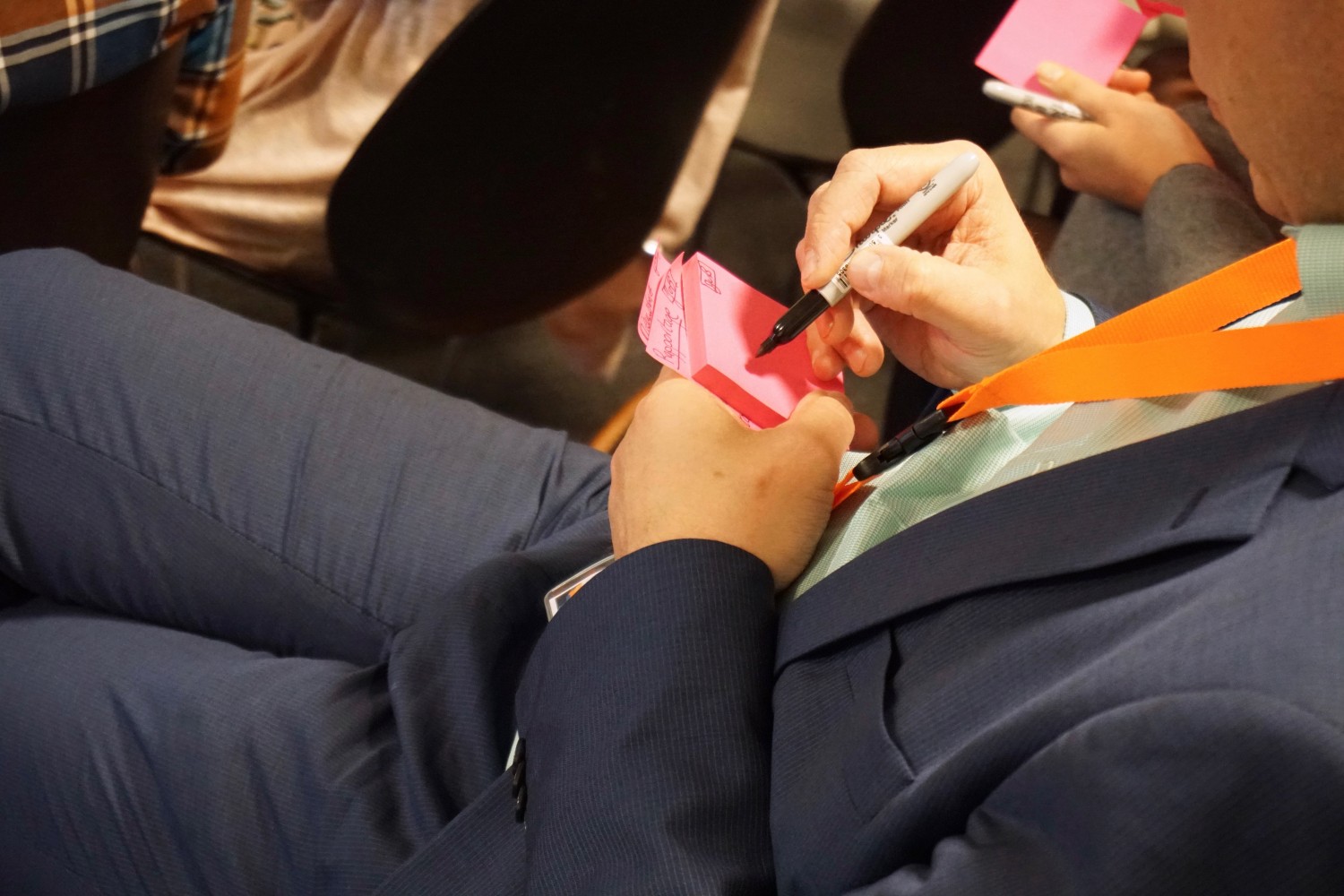 De groep werd opgesplitst in drieën, waarbij er werd gelet op branches en sectoren waarin de klanten opereren. Dit tot groot genoegen: eindelijk konden ze eens kennismaken met elkaar! Al gauw hingen er roze post its aan muur met ideeen om het platform nog beter te laten helpen bij het vertellen van het verhaal van de klant. En er zitten genoeg pareltjes tussen! Momenteel moet er nog gefilterd worden, maar we kunnen nu al vertellen dat dit zeker nog een staartje gaat krijgen...